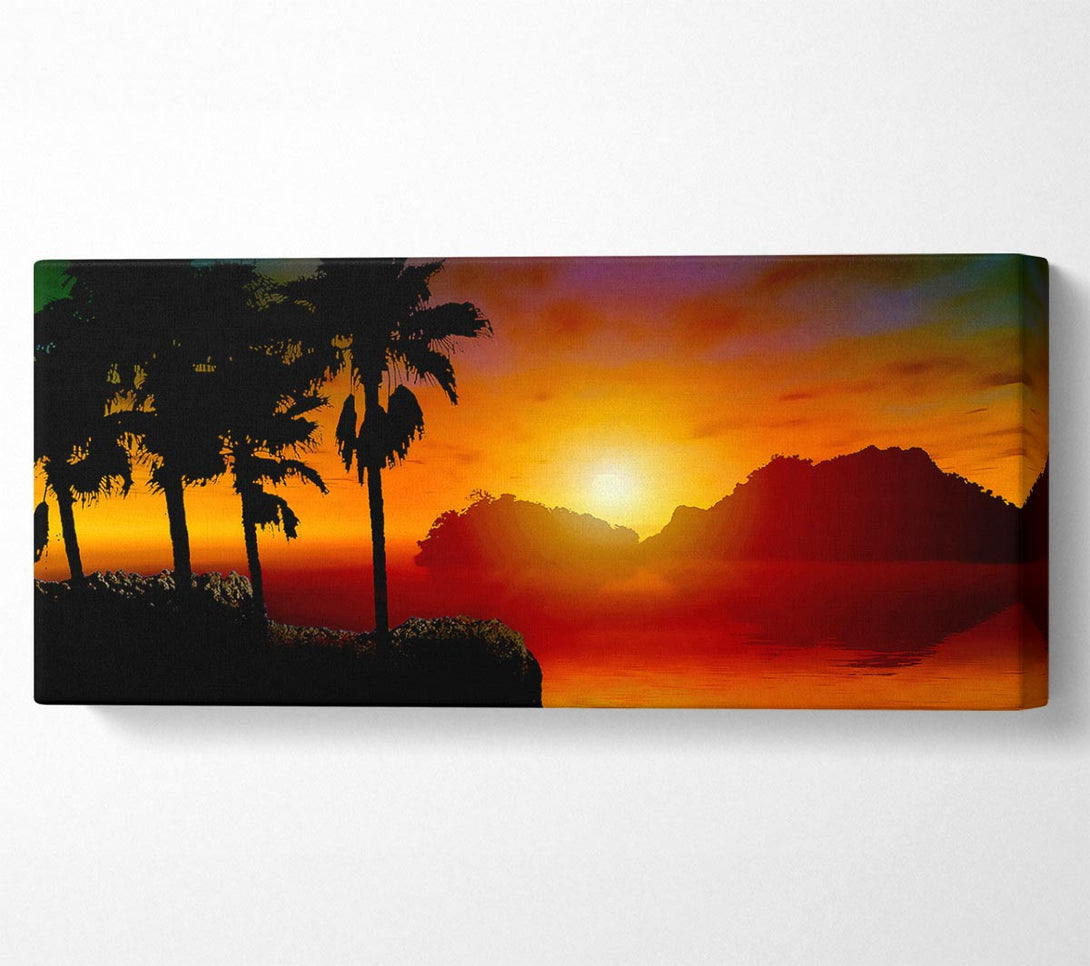 Palm Tree Orange Sun canvas, printed on coated polyester canvas. Mounted on to a 44mm box frame, ready to hang.