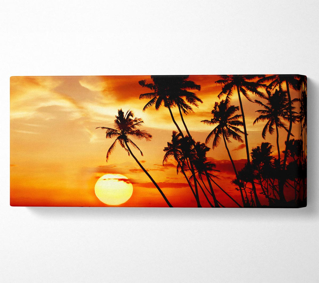 Palm Tree Paradise At Sunset canvas, printed on coated polyester canvas. Mounted on to a 44mm box frame, ready to hang.