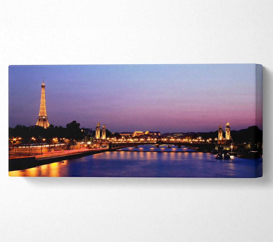 Paris Seine River At Night canvas, printed on coated polyester canvas. Mounted on to a 44mm box frame, ready to hang.