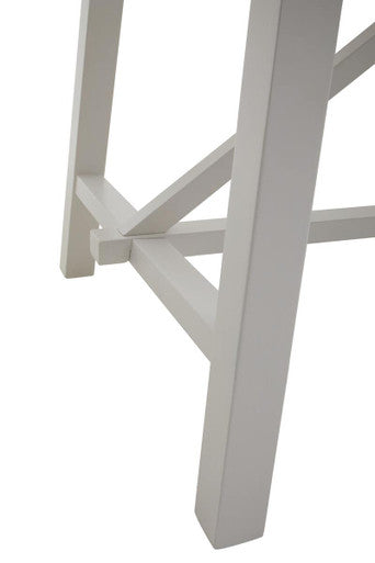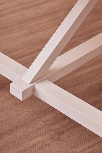 The dining table features an oak wood top in a smooth reclaimed natural finish and a birch wood base in a white finish. This table also features a sculpted sturdy structure with curved supports and gives off a farmhouse touch and durability.
