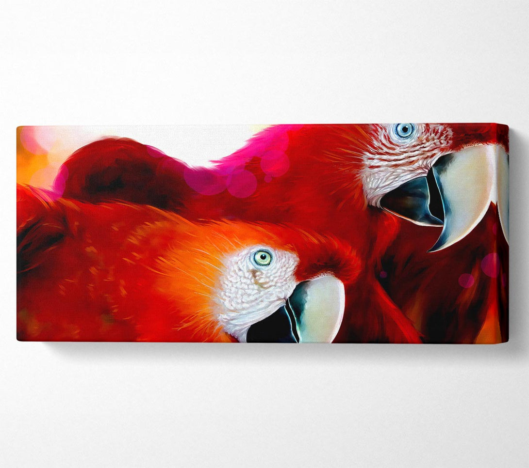 Parrots canvas, printed on coated polyester canvas. Mounted on to a 44mm box frame, ready to hang.