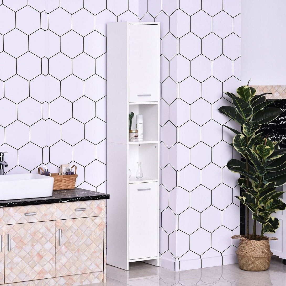 Creating a stylish storage option has never been easier! This free standing linen tower storage cabinet from HOMCOM fits nicely with any decor and can be used in the bathroom, kitchen, pantry, closet, or garage to create stylish additional storage. Constructed of solid engineered wood, it features 2 shelves and two double-tier cabinets with doors. It provides a spacious open area for your coffee maker and photos, making it more convenient to use in any indoor space. Add much needed storage to your home today with this functional storage cabinet?