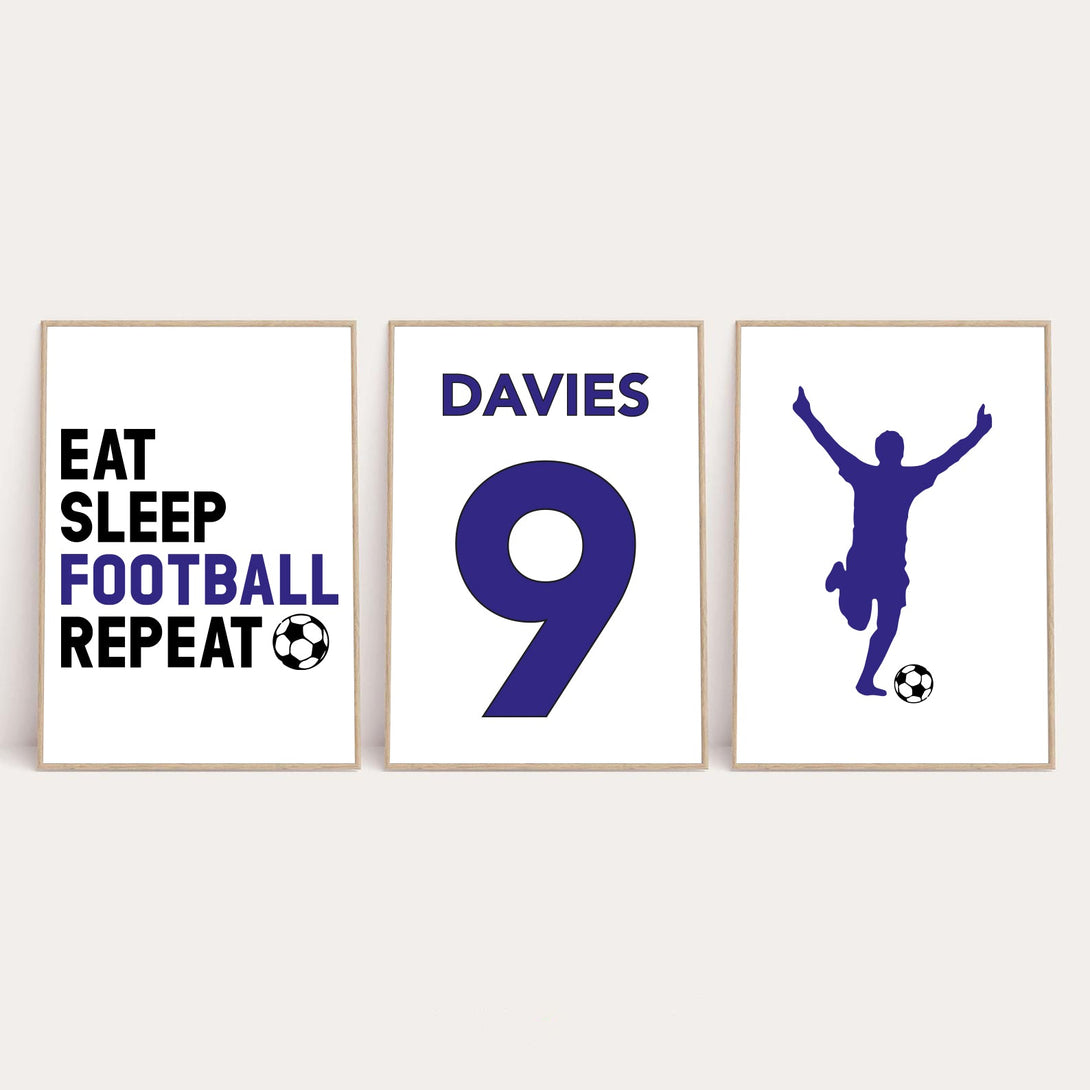 Personalised Surname Eat Sleep Football Repeat Children's Wall Decor Set Of 3 Prints (Any Colour/No.)