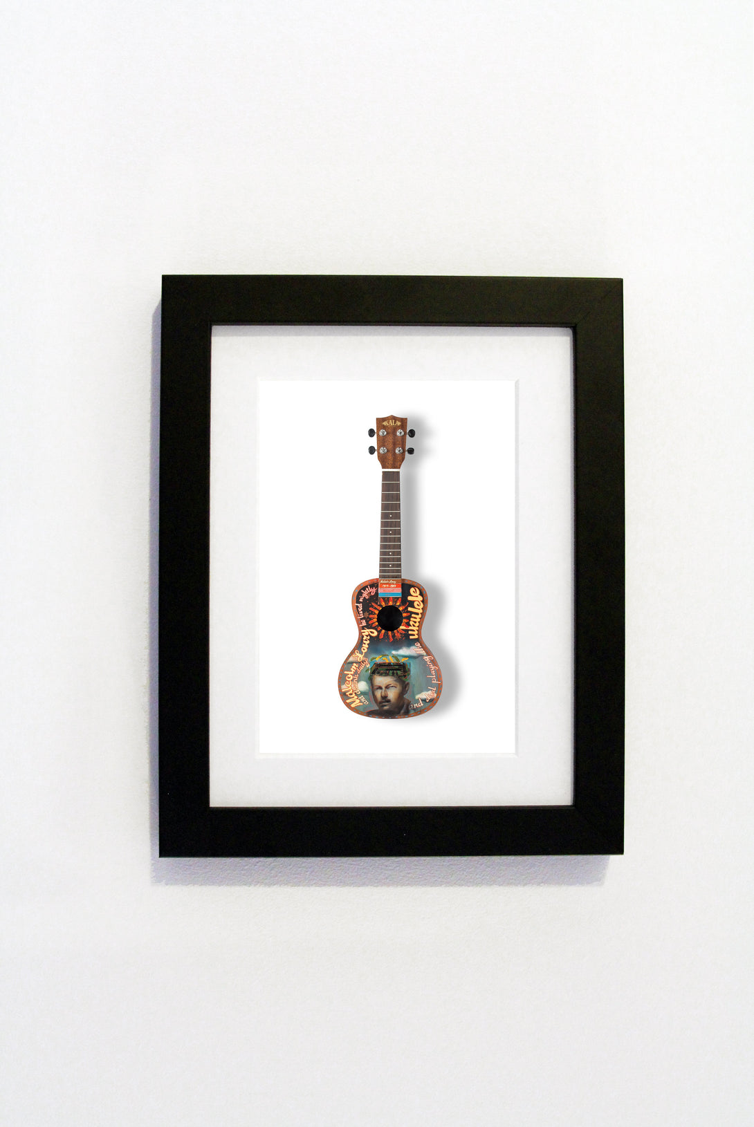 Artist statement: 'My piece is dedicated to the memory of the novelist Malcolm Lowry. This year saw the sixtieth anniversary of his death. Lowry lived a troubled life blighted by alcoholism, and his best known novel 'Under the Volcano' reflects this. Despite his troubles, I always felt that his chosen epitaph: "Malcolm Lowry he lived nightly and drank daily and died playing the ukulele" reflects both his torment and a more playful side to his character. My piece celebrates him, his day and night temperament, and his epitaph.'