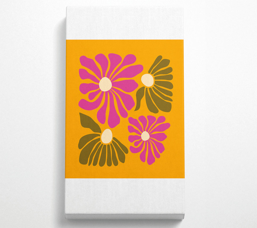 Pink Flowers On Orange wide canvas, printed on coated polyester canvas. Mounted on to a 44mm box frame, ready to hang.