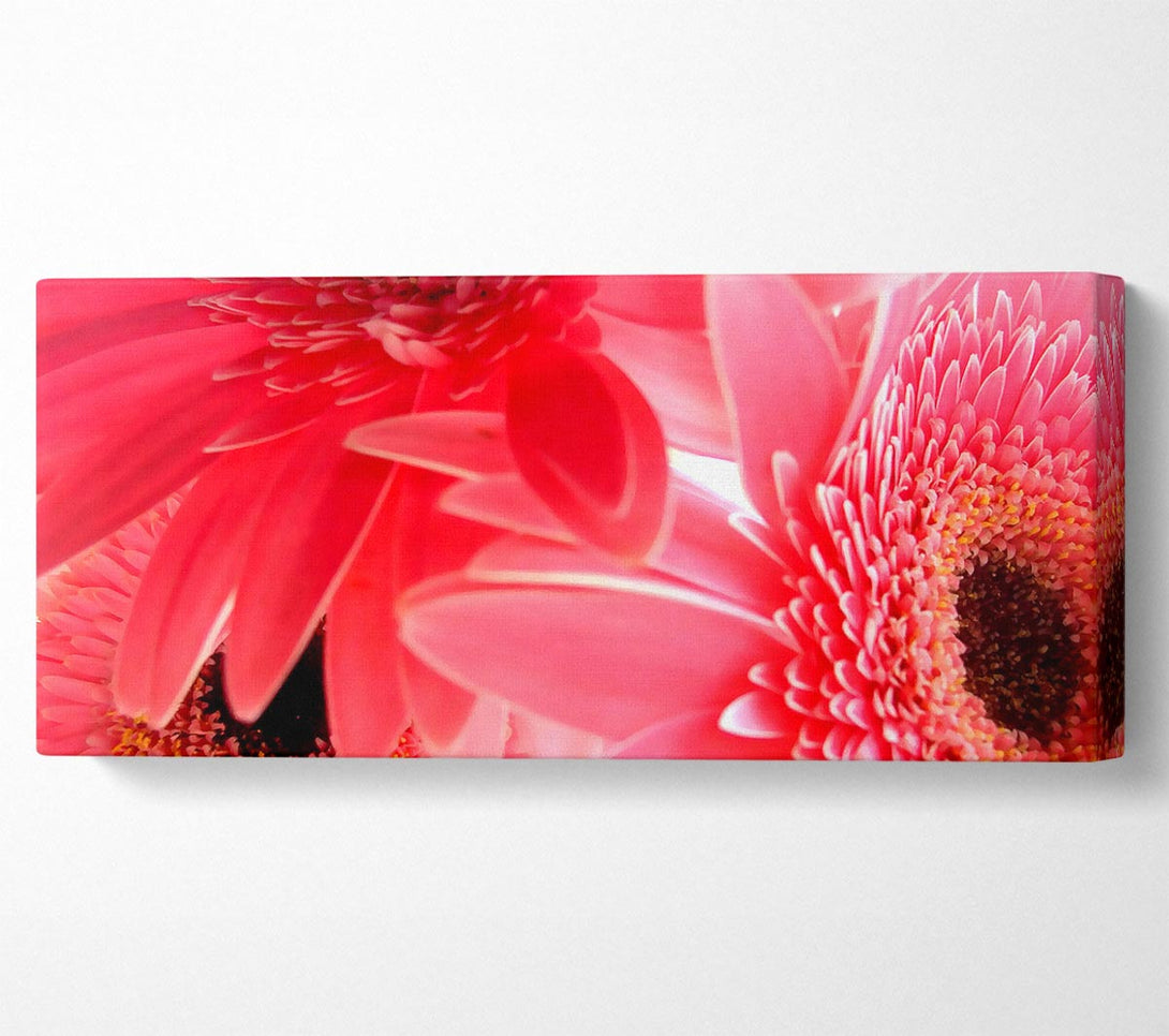 Pink Gerbera Flower Mayhem canvas, printed on coated polyester canvas. Mounted on to a 44mm box frame, ready to hang.