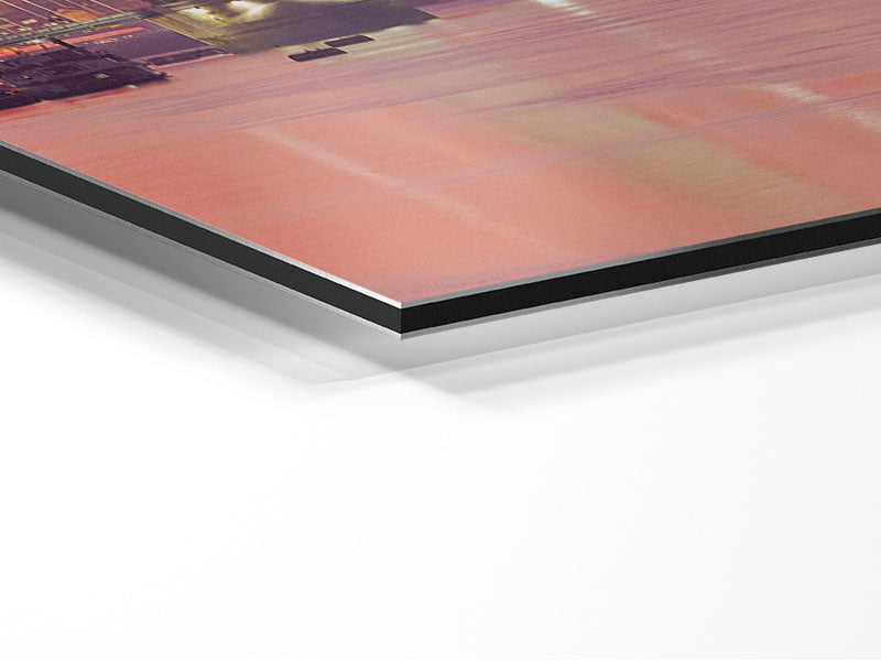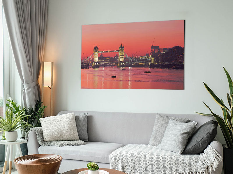 Pink Nights Through The Tower Bridge Printed on brushed aluminium dibond. A modern way to display art and easy to maintain.