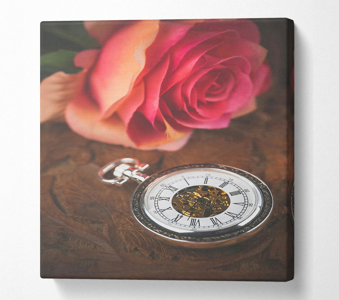 Pink Rose And Timepiece Canvas Wall Art