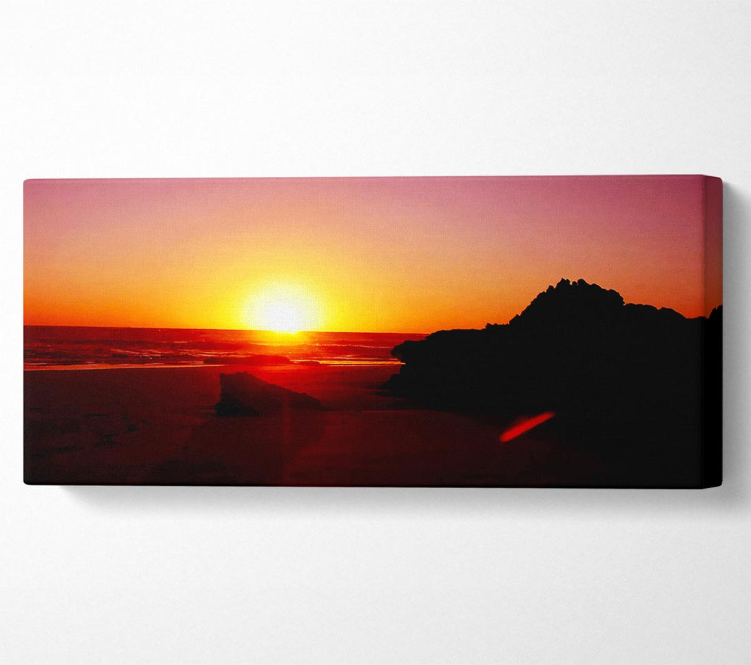 Pink Sunset Horizon Over The Ocean Rocks canvas, printed on coated polyester canvas. Mounted on to a 44mm box frame, ready to hang.