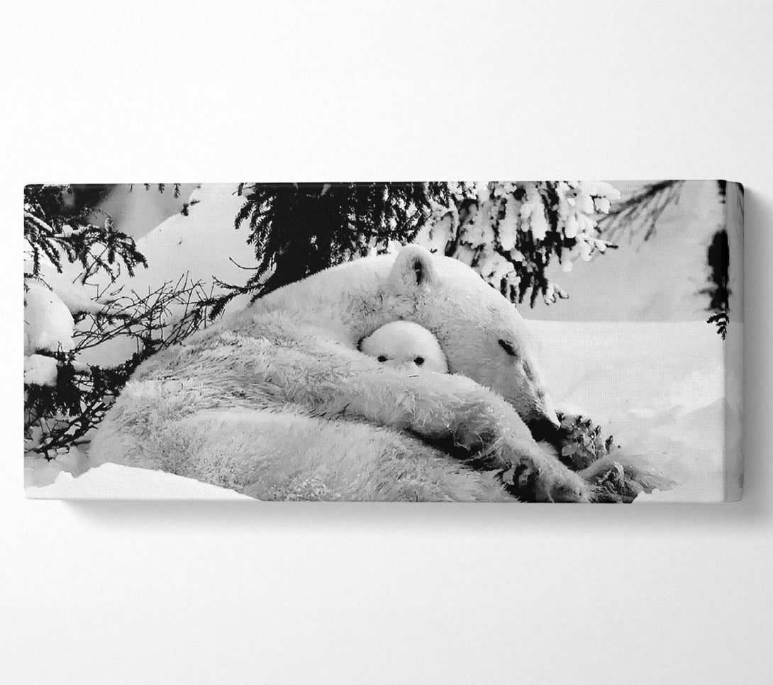 Polar bear Hug canvas, printed on coated polyester canvas. Mounted on to a 44mm box frame, ready to hang.