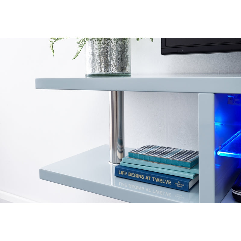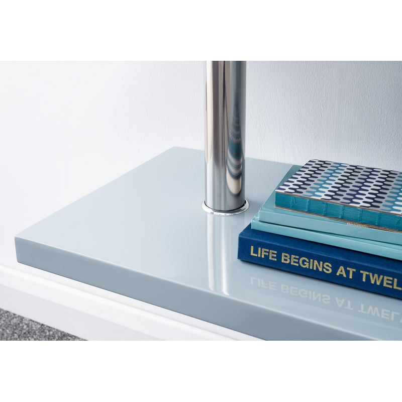 The central open section with an adjustable LED-backlit toughened glass shelf is flanked by twin chrome pillar supports. Cable management bezels take care of untidy wires. Part of the Polar Collection.