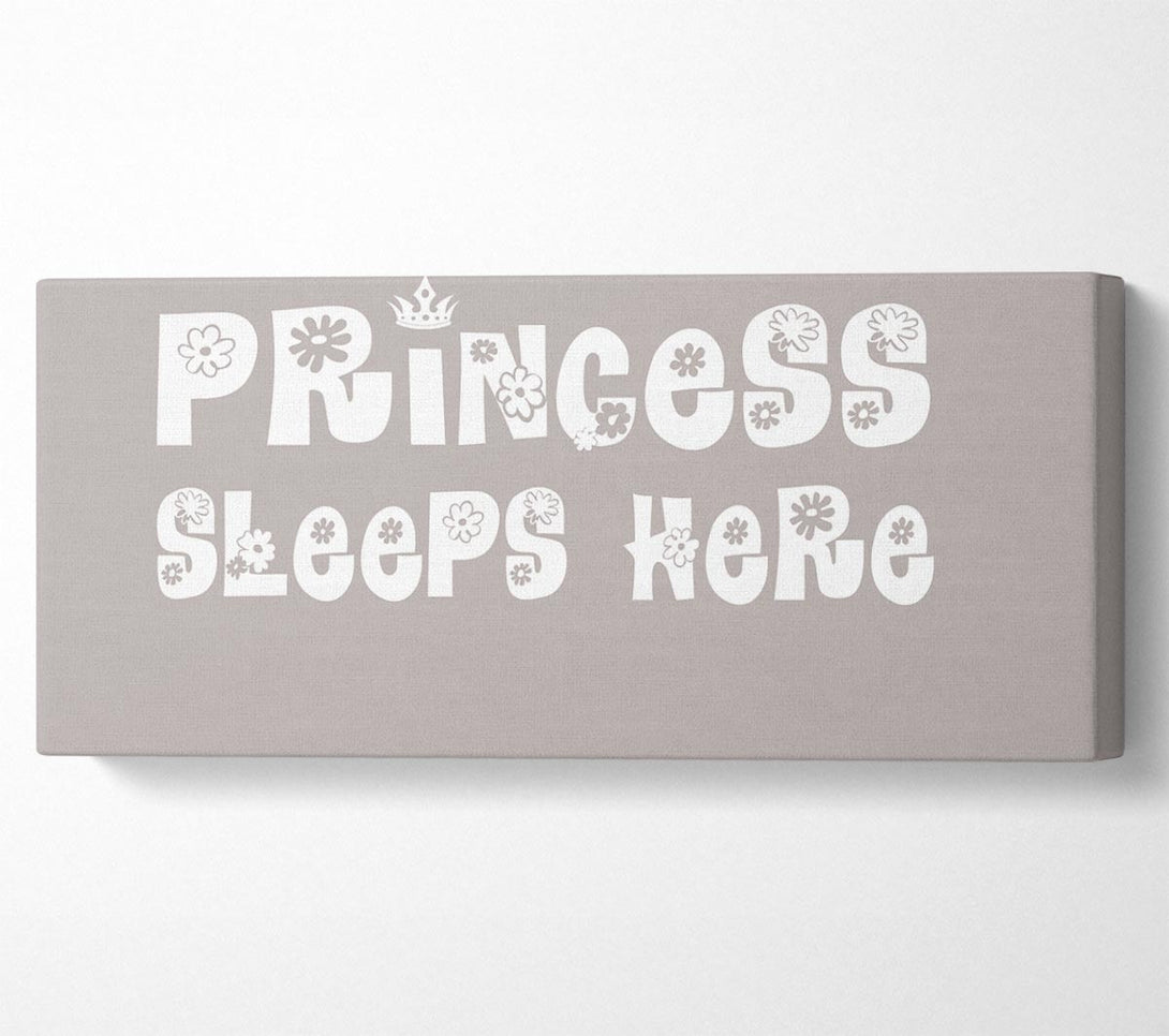 Princesss Sleeps Here Beige canvas, printed on coated polyester canvas. Mounted on to a 44mm box frame, ready to hang.