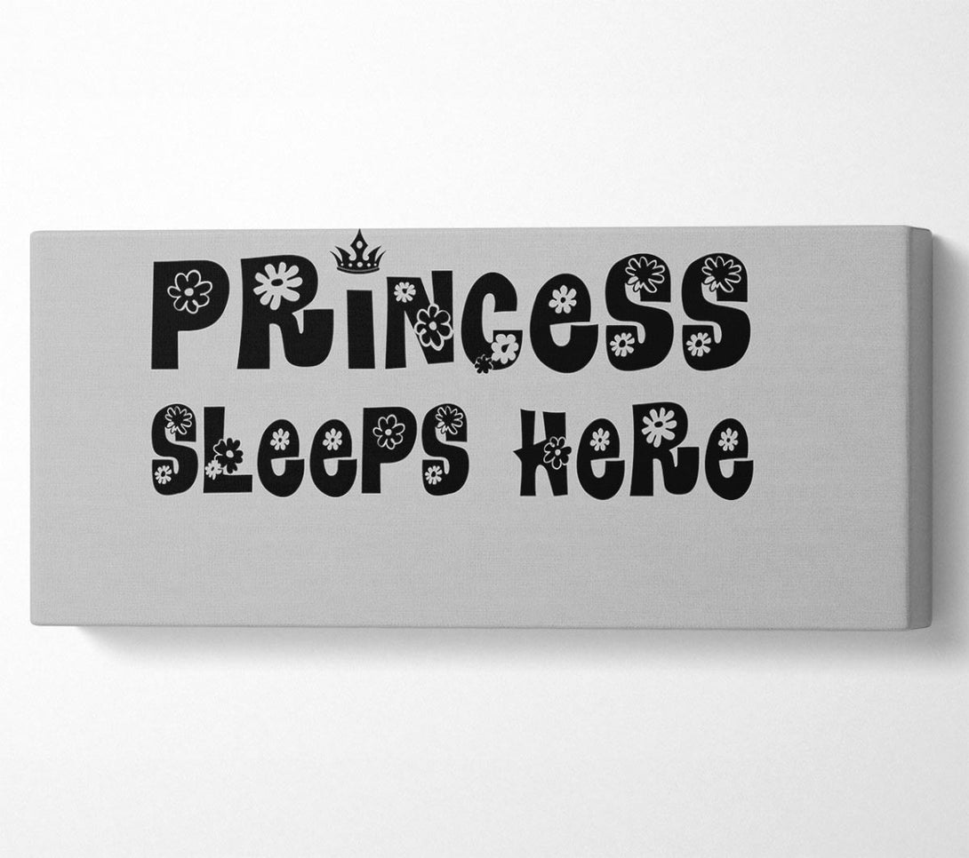 Princesss Sleeps Here Grey canvas, printed on coated polyester canvas. Mounted on to a 44mm box frame, ready to hang.