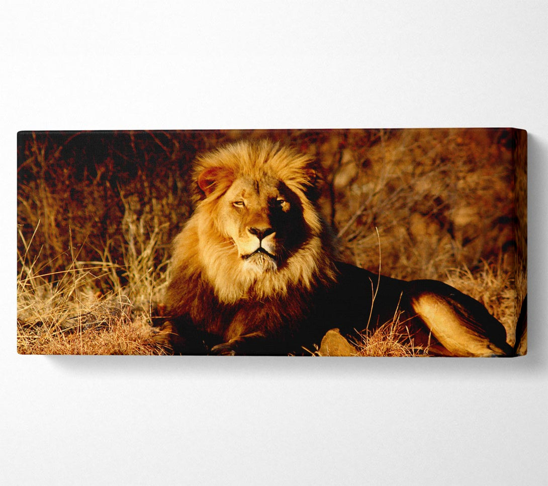 Proud African Lion canvas, printed on coated polyester canvas. Mounted on to a 44mm box frame, ready to hang.