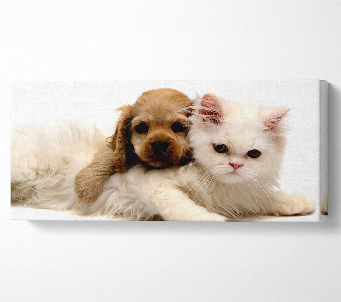 Puppy And Kitten Love canvas, printed on coated polyester canvas. Mounted on to a 44mm box frame, ready to hang.