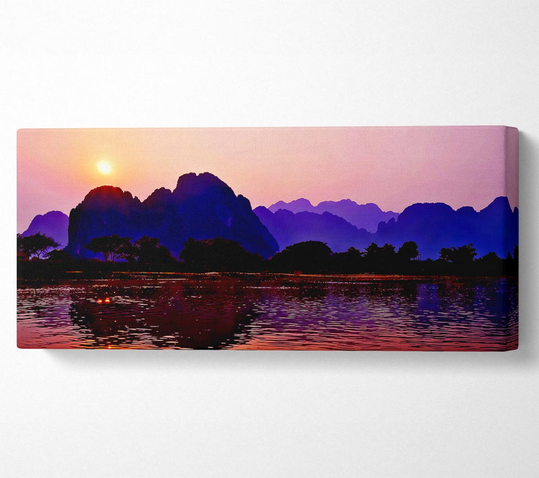 Purple Mountains At Sunrise canvas, printed on coated polyester canvas. Mounted on to a 44mm box frame, ready to hang.