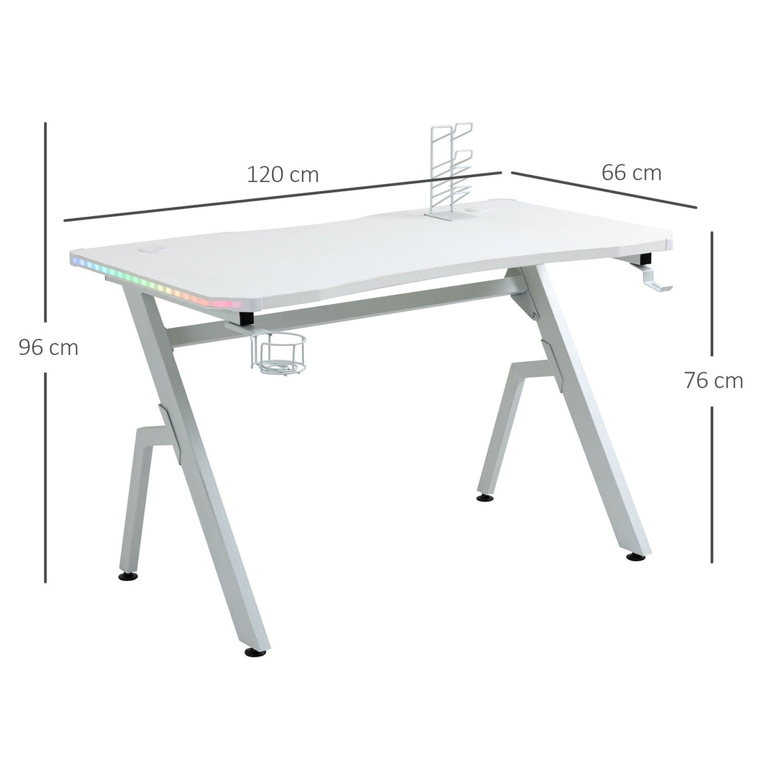 Light up your gaming in cool style with this computer desk from HOMCOM. Using powder-coated steel for the frame, the gaming PC desk is formed into a 'R' leg design for balance, with adjustable foot pads to suit uneven floors. On each side there is an LED strip which lights up in an array of colours; brightness and speed can be controlled by the included remote: easy to pick a motion which you like. Corners are rounded for safety. Finished with handy headphone hook and cup and controller holder.