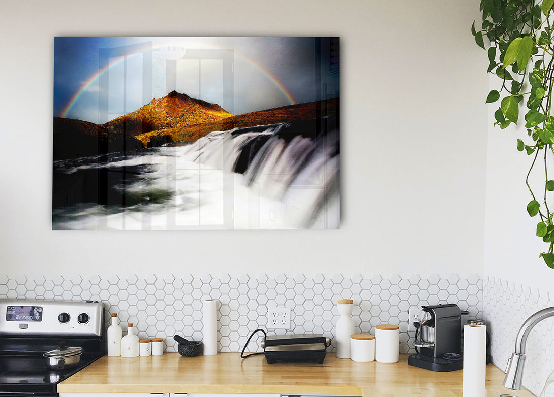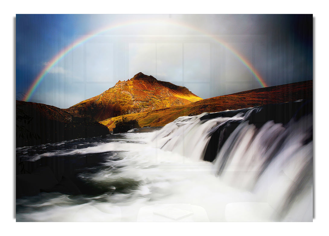 Rainbow Mountain Falls acrylic print, UV printed onto 5mm thick acrylic glass. Comes with everything you need to hang on your wall.
