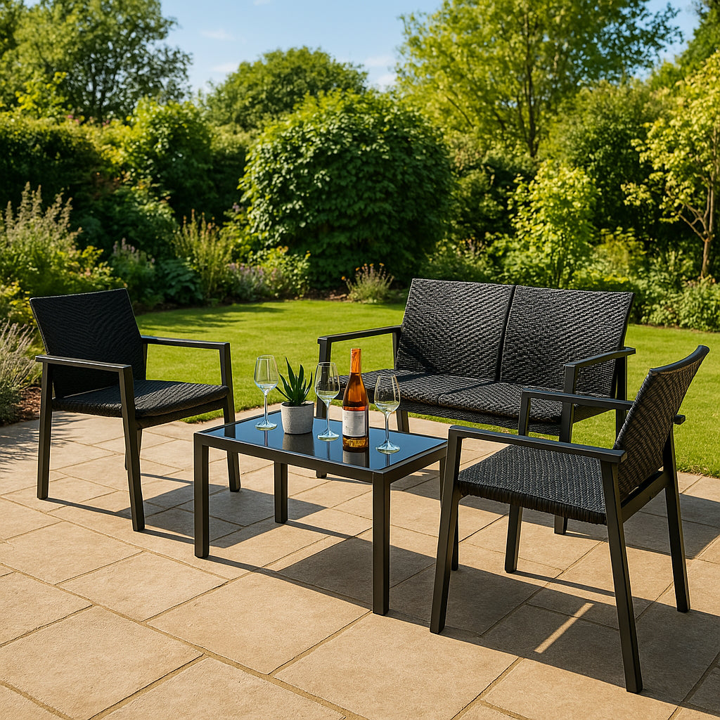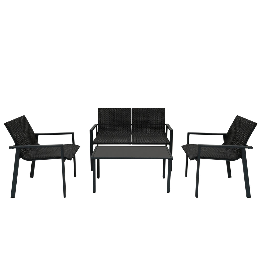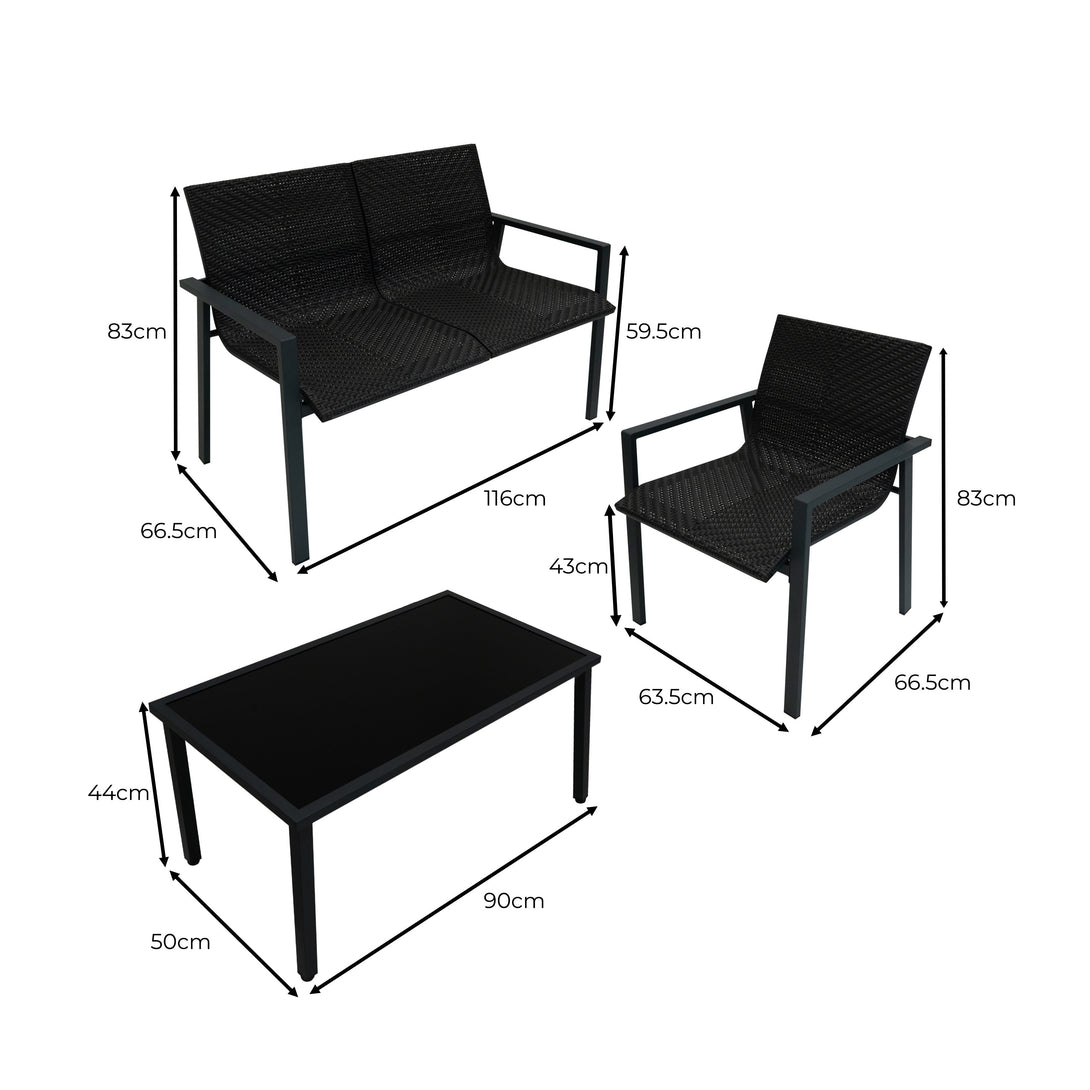 Featuring two comfortable chairs, a matching two-seater sofa, and a sleek glass-top coffee table, this set is the perfect addition to any garden, patio, or balcony. The elegant black machine-woven polyrattan offers a modern yet timeless look, seamlessly blending with any outdoor decor while providing a sturdy and weather-resistant structure. Whether you're enjoying a morning coffee or entertaining guests, this set ensures both comfort and functionality.