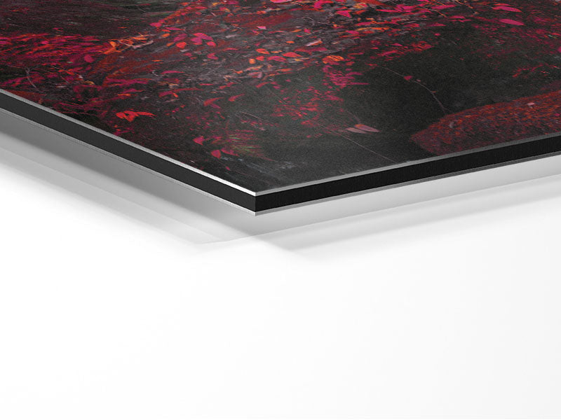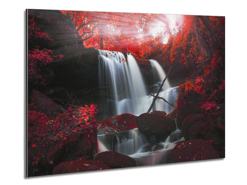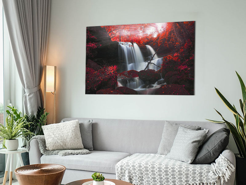 Red Forest Waterfall Delight Printed on brushed aluminium dibond. A modern way to display art and easy to maintain.
