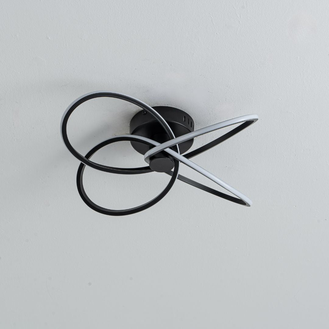 With an eye-catching, intertwined loop design and a sleek matte black finish, this modern ceiling light makes a powerful statement while maintaining a minimalist charm. Its integrated LED lighting emits a warm, inviting glow at 3000 Kelvins, ideal for enhancing the ambiance of spacious living areas, open-plan kitchens, or master bedrooms.
