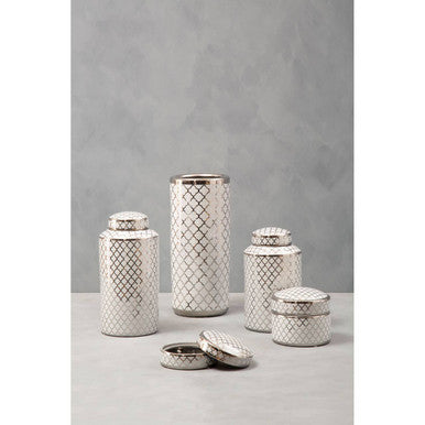 This large box is made from tactile ceramic, and has a glazed finish that adds to its reflective aesthetic. It features a silver quartefoil pattern on cool white, suitable for styling with geometric textiles and accessories.