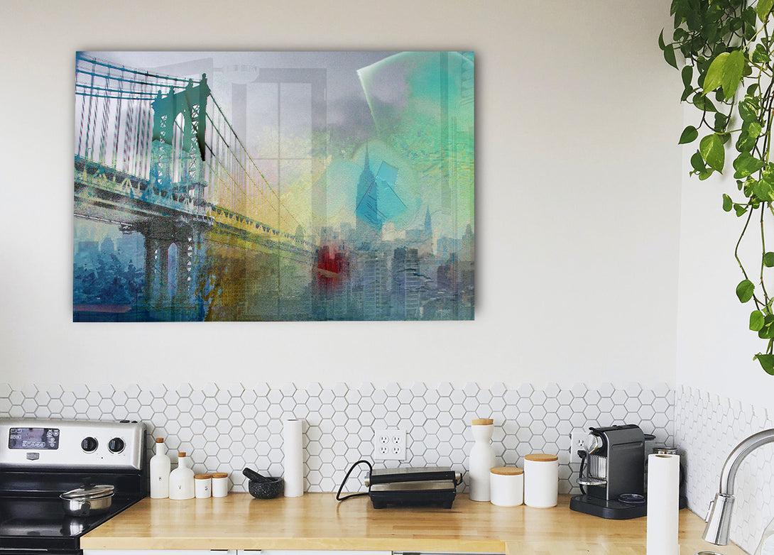 Retro City Patchwork acrylic print, UV printed onto 5mm thick acrylic glass. Comes with everything you need to hang on your wall.