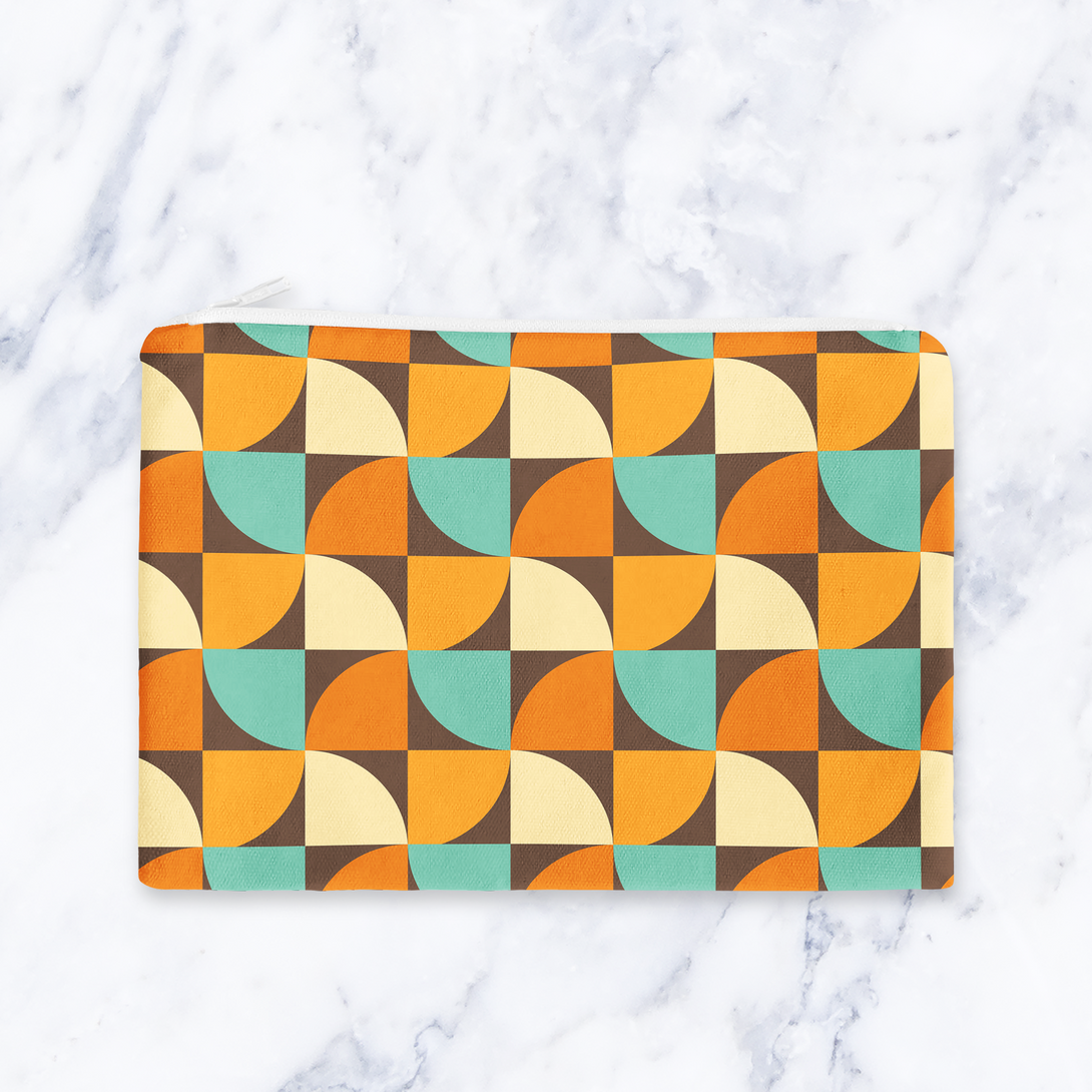 Add a splash of retro style to your daily routine with this bold orange geometric makeup bag. Featuring a striking 70s-inspired quarter circle pattern in shades of orange, teal, brown, and cream, this eye-catching cosmetic pouch is designed and handmade by Shadowbright for lovers of vintage and geometric design.