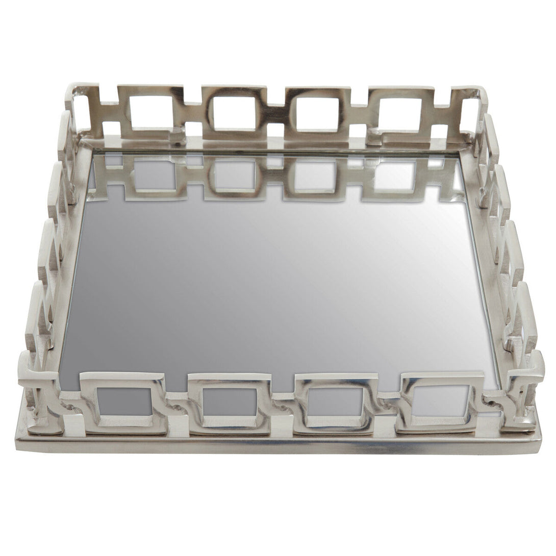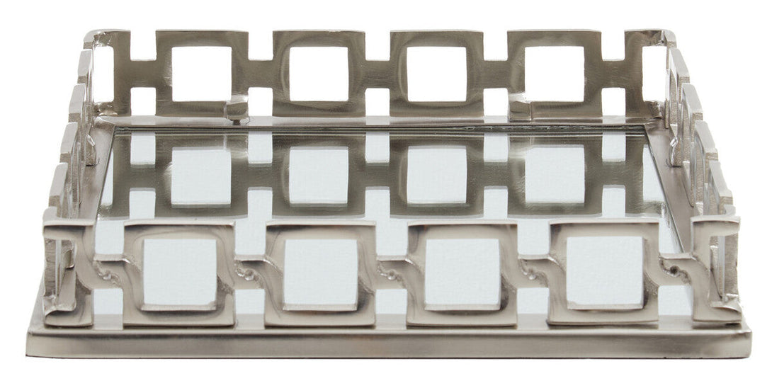 Elevate any modern room with the Rhoda square nickel finish mirror tray. The nickel finish and clean lines combine with the mirrored surface create a glamorous addition to you decor.