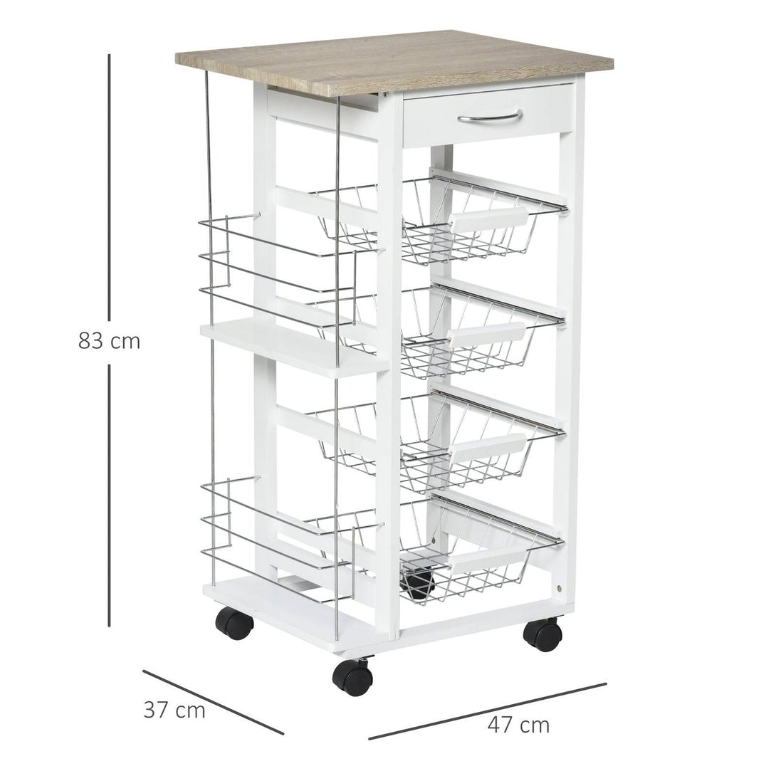 Looking to maximize your kitchen? Need a kitchen storage cart for your apartment or dorm room that won't take up tons of space? This kitchen storage cart features a compact and simple design that can be fit into various styles of decorations. Four slide-out metal baskets offer lots of storage of dry food, fruits and vegetables. Side racks are great for spices and the top drawer for cutlery and utensils and four wheels to ensure easy and smooth movement across the floor.