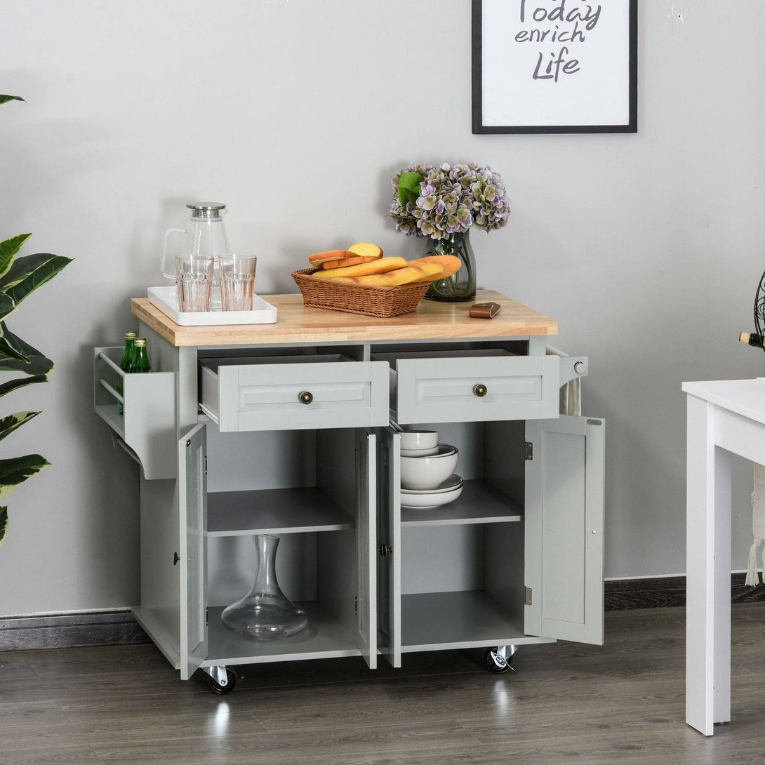 Rolling Kitchen Island Storage Trolley with Rubber Wood Top & Drawers for Dining Room