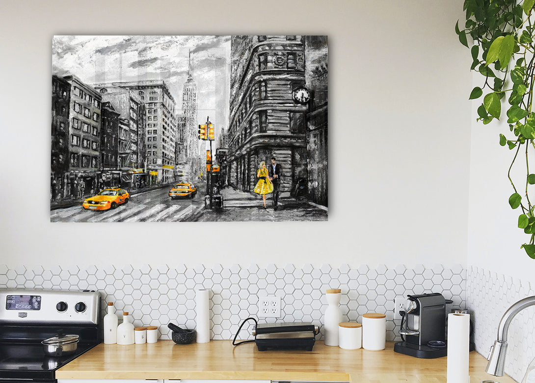Romantic Walk In The Big Yellow City acrylic print, UV printed onto 5mm thick acrylic glass. Comes with everything you need to hang on your wall.