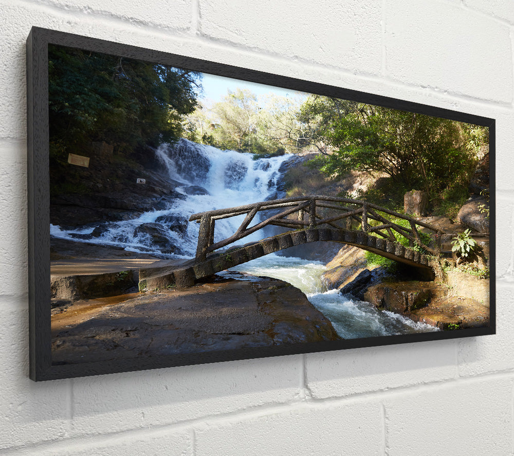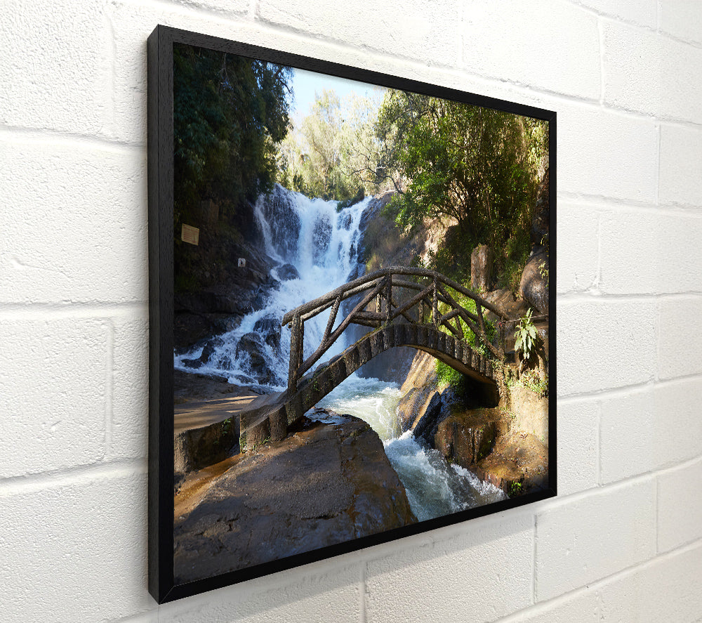 Rustic made bridge by a waterfall