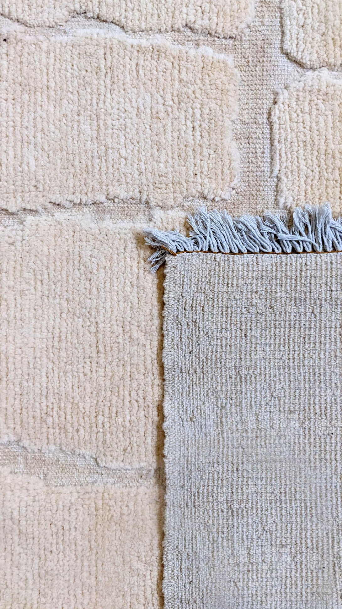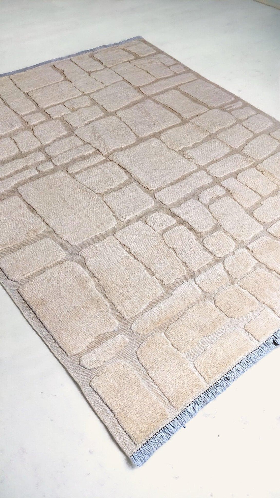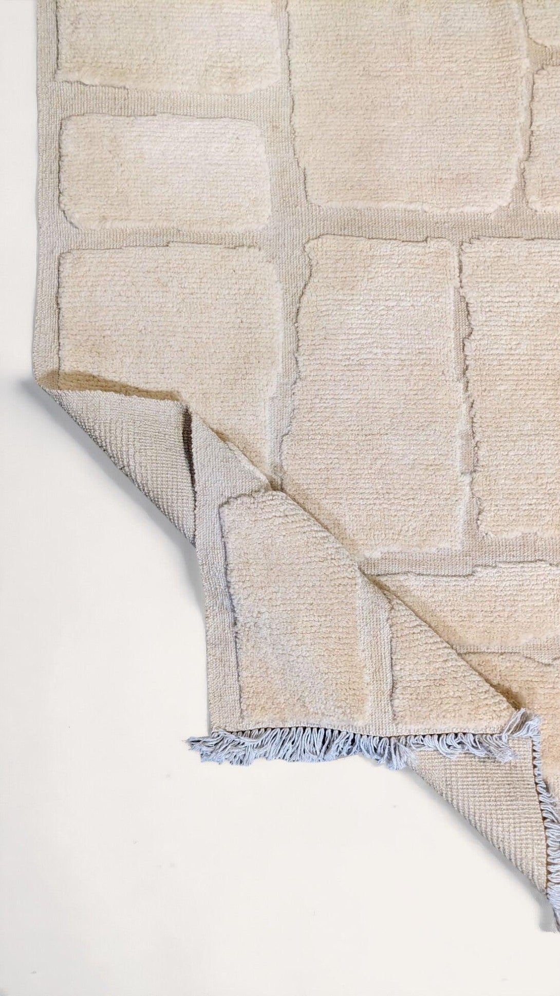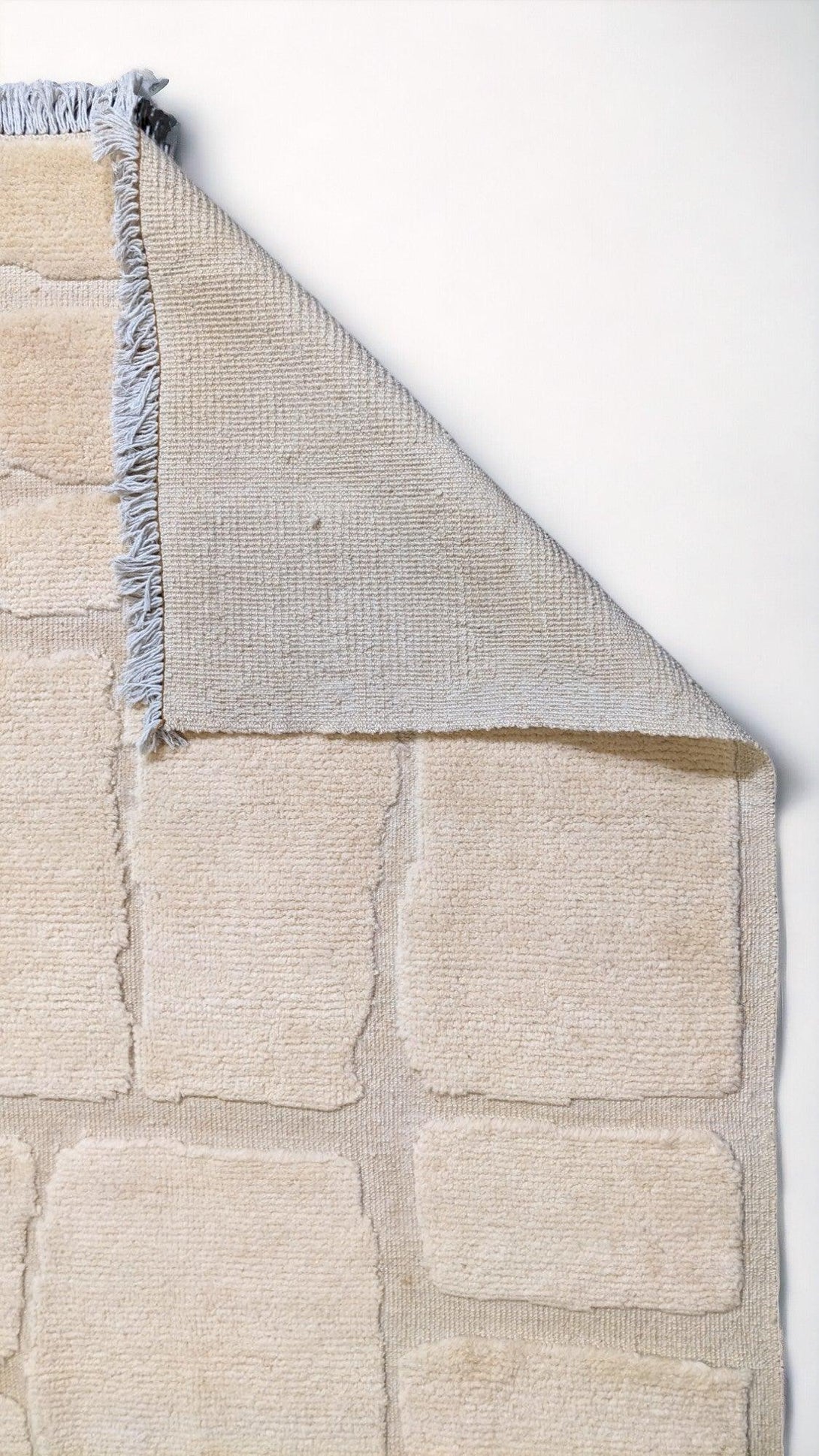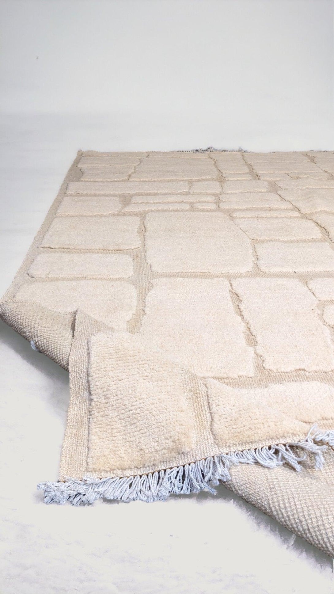 Efficiently crafted and uniquely designed, the Satori abstract Nordic-style rug boasts a splendid cobblestone pattern with a textured feel, a simple geometric pattern with various-sized rectangles arranged in an offset grid, and a neutral colour palette with fringe detailing. Each piece is carefully hand-knotted and carved from premium undyed wool, making it both durable and eco-friendly.