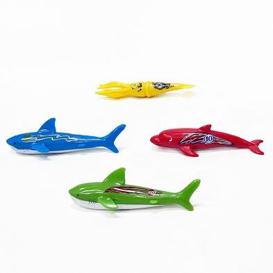 These sea animal dive sticks are perfect for bringing additional fun to swimming pool sessions at the local pool or away on holiday. Designed to glide through the water and be easy to spot. Pack of four, with two sharks, a dolphin and a squid.Approximate product dimensions (each): (H) 3cm x (W) 4cm x (D) 13cmPlease note: lifestyle photographs for illustration, 1x product listed supplied only. Colours and designs may be updated or vary slightly. Please read all packaging and instructions thoroughly before use.When children are in the water they should be supervised at all times. Not suitable for children under 36 months old choking hazard due to small parts.
