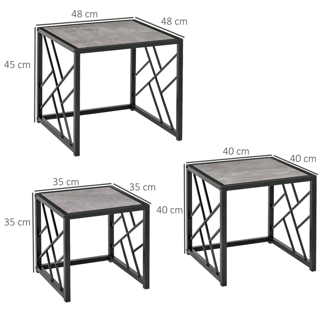 Three times simple, everyday beauty for your living space with this stacking coffee table set from HOMCOM. Consisting of a large, a medium and a smaller sized table, each table is made using a black metal frame for a stable and durable core. The frames, made from metal for strength, come with a criss-cross design on the side for a point of difference. And when done, you can stack them neatly together.