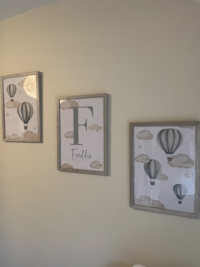 Set Of 3 Personalised Name Hot Air Balloons Netural & Blue Watercolour Nursery Children's Boho Netural Room Wall Decor Print