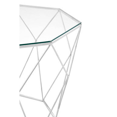 Silver colour of the Shalimar coffee table makes it suited to coordination with silver and gold accessories. The iron structure produces an octagonal shape at the top, into which a tabletop made from clear tempered glass is set.