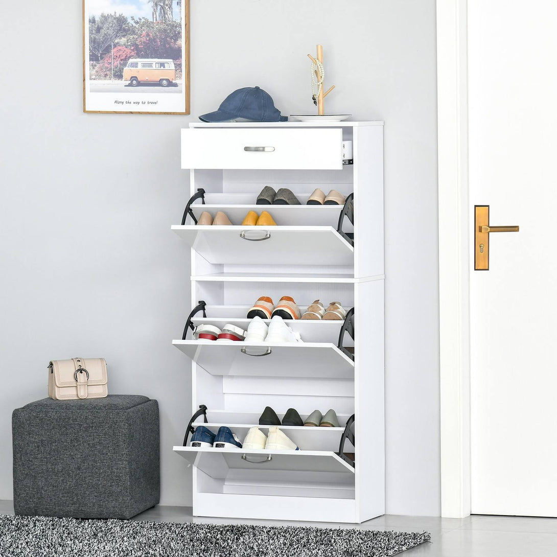 Choose this cabinet from HOMCOM will keep your home tidy. There are three flip drawers, each can hold six pairs - perfect for use with the family or your flatmates. The inner shelf can be set to two different positions for storage which fits your shoes better. Finished with a handy top drawer, offering even more storage. Made of particle board frame with gloss panel and aluminium handle, it is durable for everyday use. The high gloss storage unit in modern style is a great addition to your home.