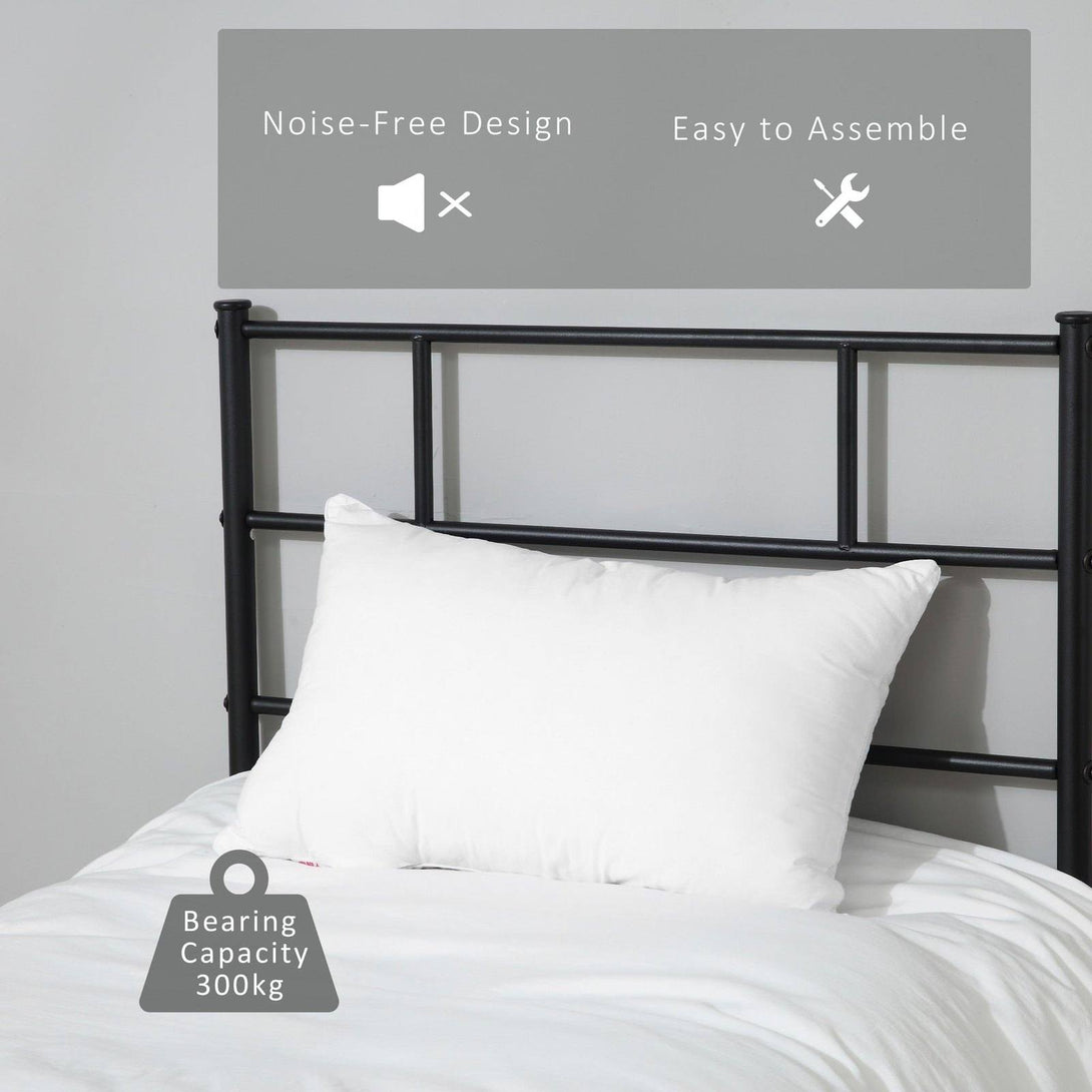 Make dream times minimal with this bed frame from HOMCOM. The slim-cut frame, in a matte black finish makes it suitable for practically any bedroom space - whatever your interior decor. Made from metal with sturdy legs, this frame will keep you supported so you can rest and relax in peace - with the built-in slats and tall headboard holding your mattress in place at all times. Comes with spacious under-bed clearance, giving you handy, out-of-sight storage space.