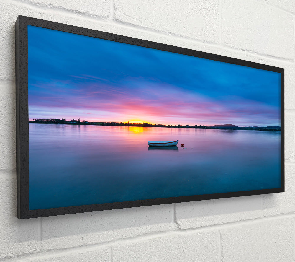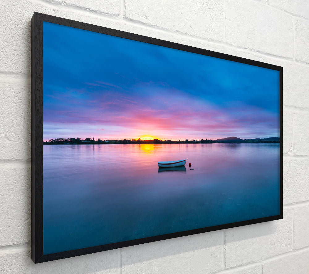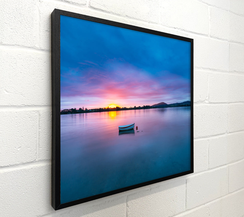 Small row boat on calm lake