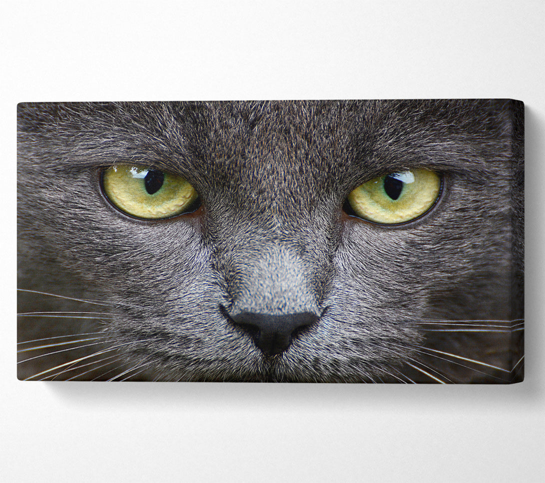 Smokey Grey Cat wide canvas, printed on coated polyester canvas. Mounted on to a 44mm box frame, ready to hang.