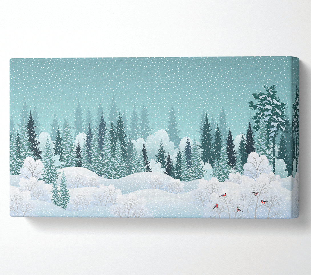 Snow In Amongst The Trees wide canvas, printed on coated polyester canvas. Mounted on to a 44mm box frame, ready to hang.
