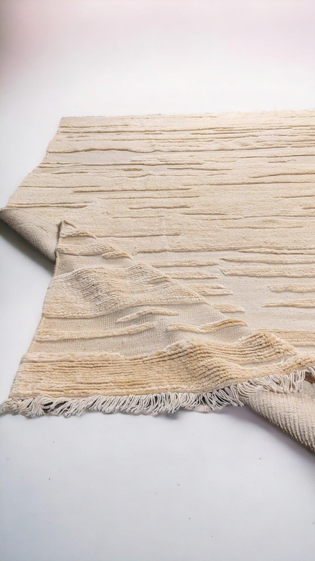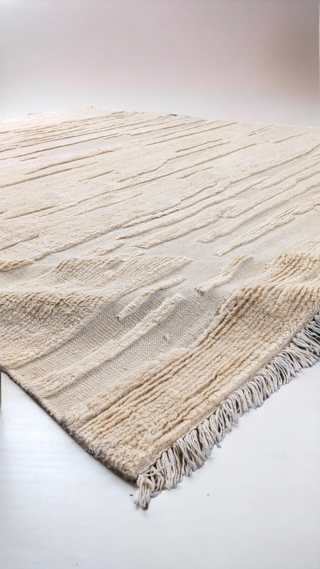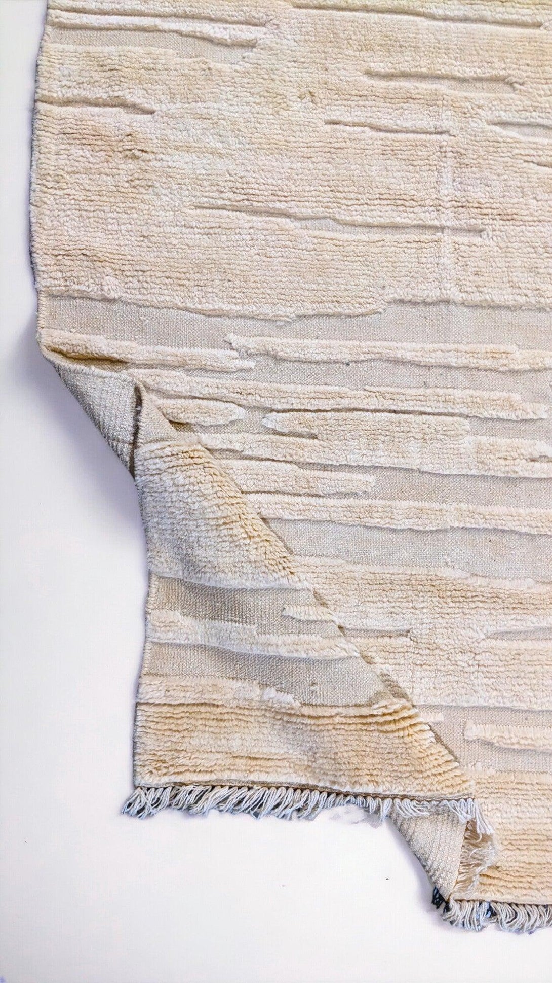Snugly Nordic rug, expertly woven with the finest undyed wool by artisans, has a lovely textural characteristic reminiscent of wind-blown desert sands due to the slight variations in the wool's natural hue. The soft, fluffy pile encourages barefoot relaxation, while the linear design offers a hint of timeless interest.