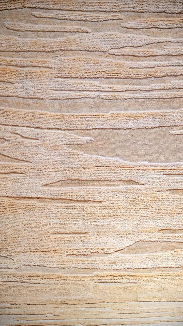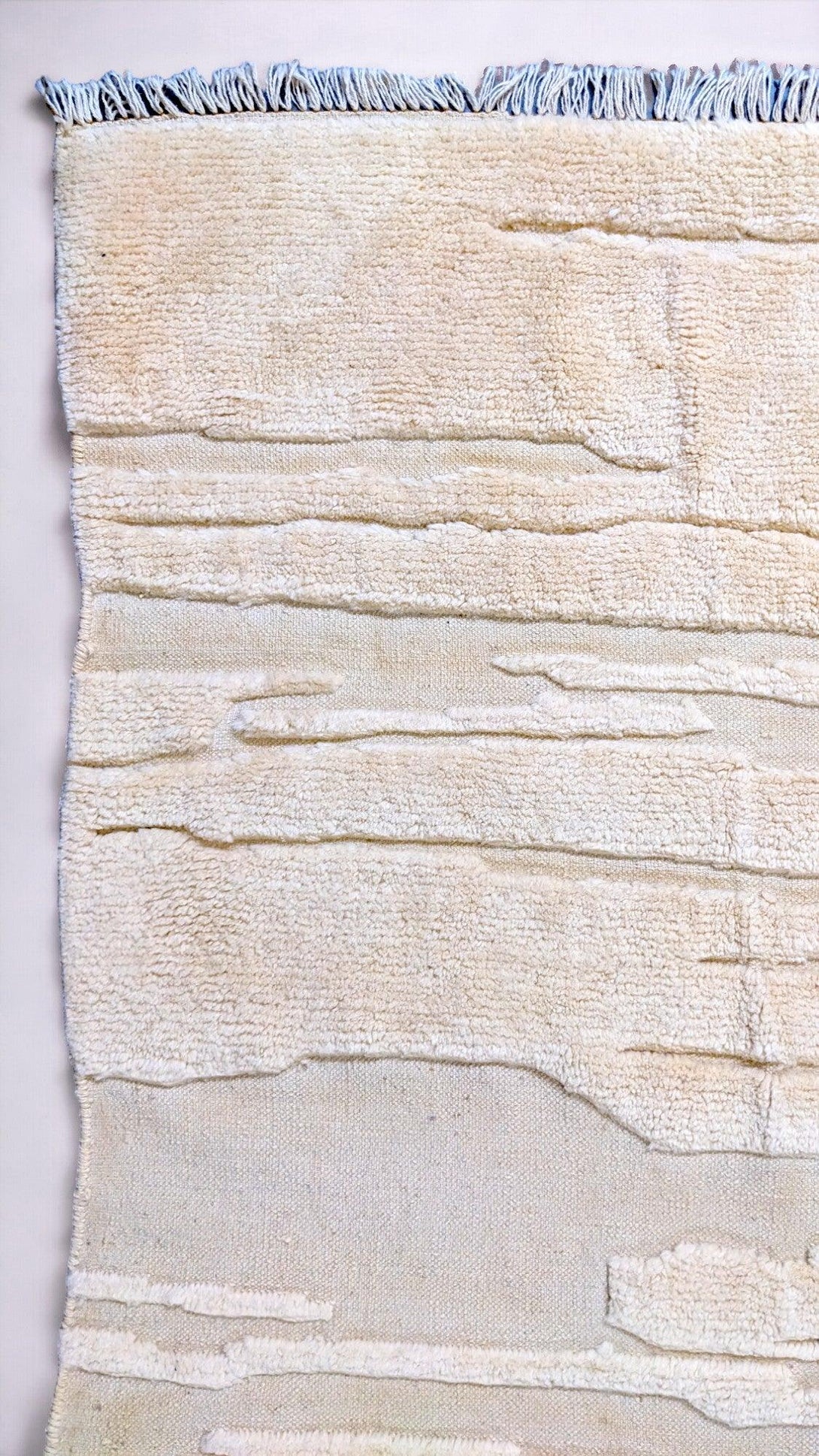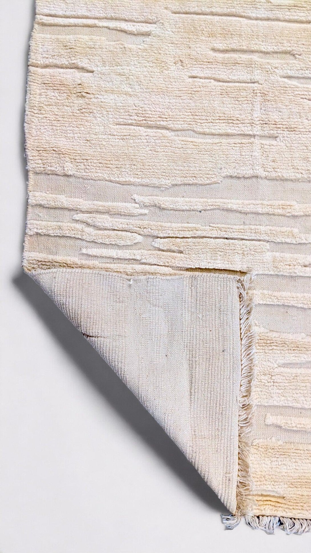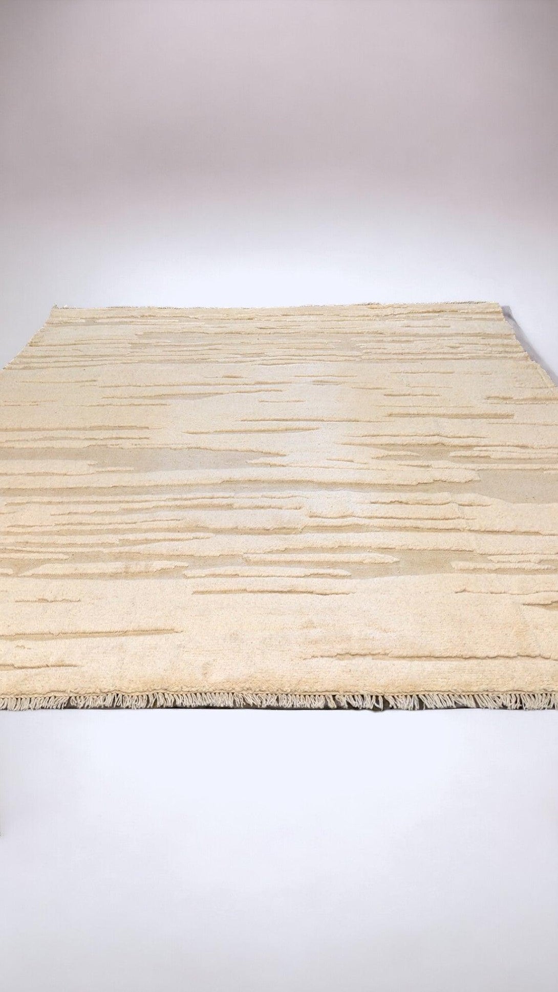 Snugly Nordic rug, expertly woven with the finest undyed wool by artisans, has a lovely textural characteristic reminiscent of wind-blown desert sands due to the slight variations in the wool's natural hue. The soft, fluffy pile encourages barefoot relaxation, while the linear design offers a hint of timeless interest.