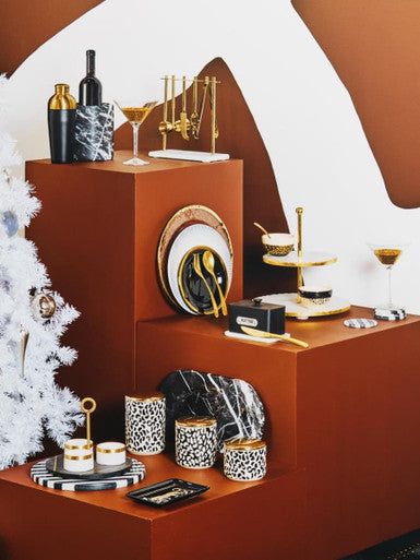 The Soma set of four round marble coasters feature a bold black and white stiped pattern, creating a contemporary aesthetic.