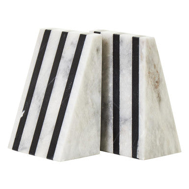 The Soma set of two white marble bookends feature vertical striped black marble, creating a contemporary aesthetic.