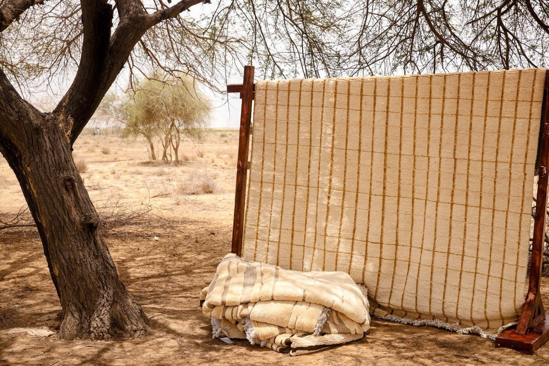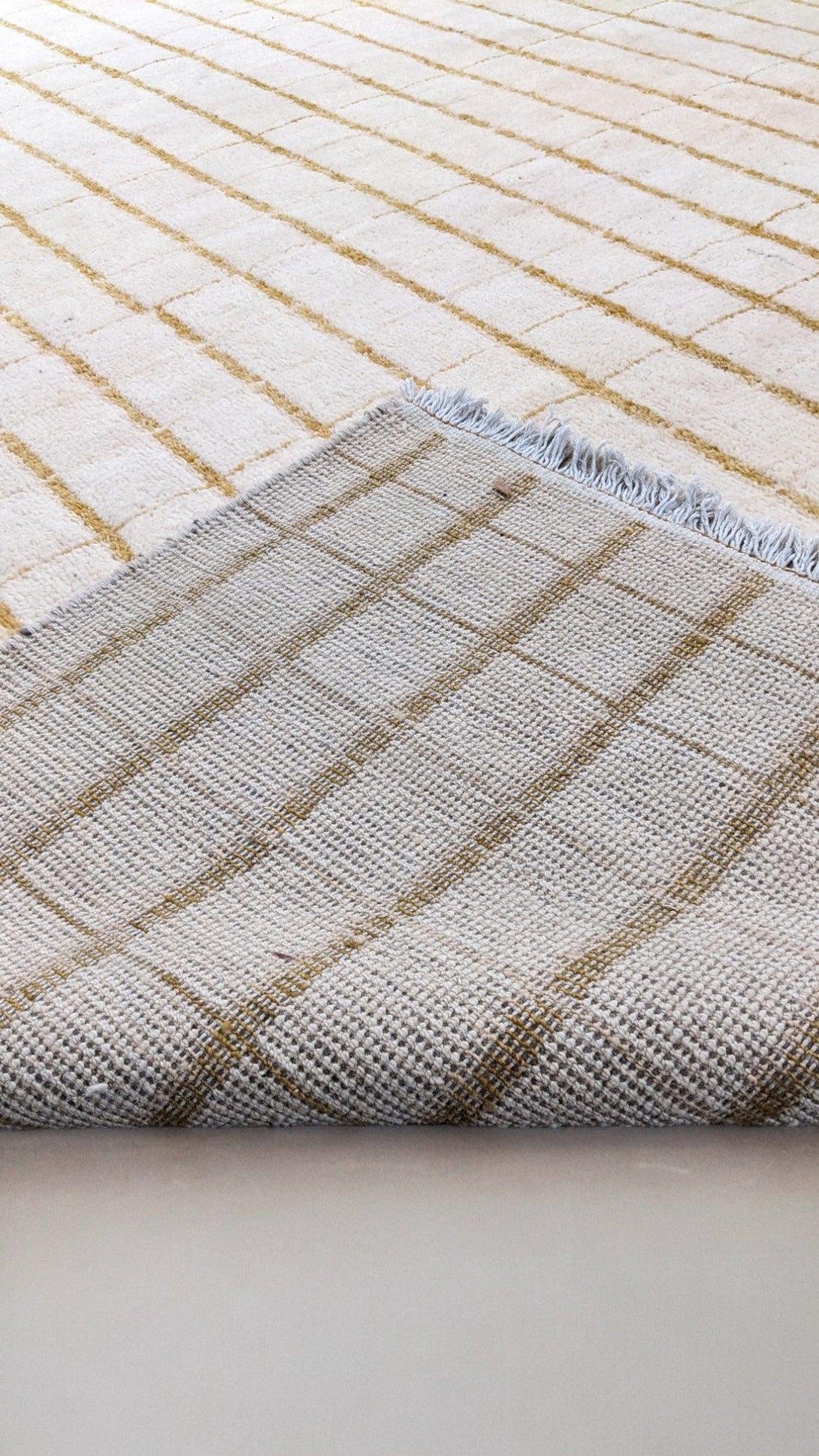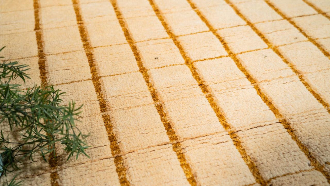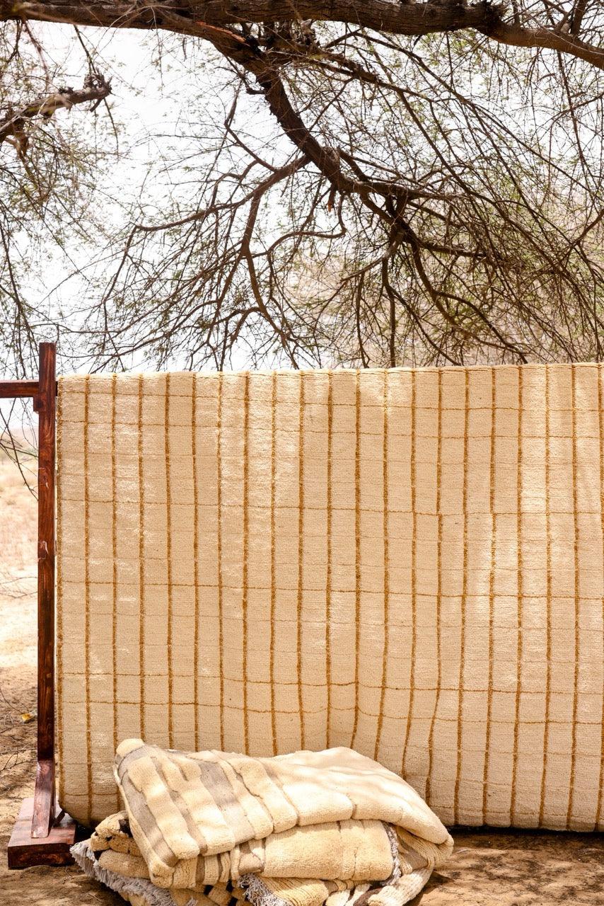 The Stormy Stripe Rug showcases timeless Nordic style with a hand-knotted wool blend. A simple grid pattern in neutral beige and off-white hues creates effortless sophistication, grounding any room with its minimalist, striped design and soothing colour palette.