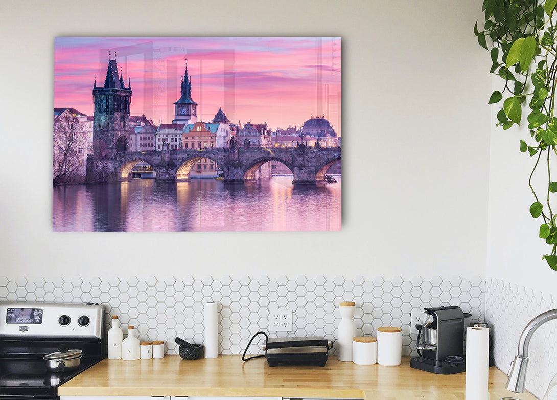Stunning Charles Bridge Pink acrylic print, UV printed onto 5mm thick acrylic glass. Comes with everything you need to hang on your wall.