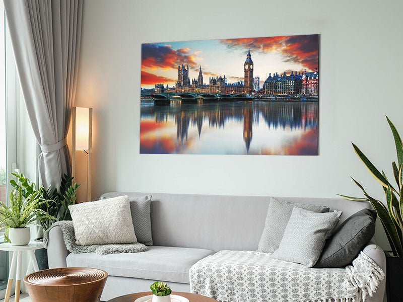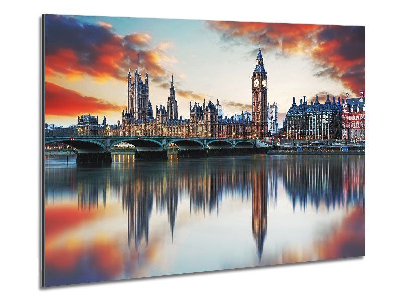 Stunning Reflections Of The Houses Of Parliament Printed on brushed aluminium dibond. A modern way to display art and easy to maintain.